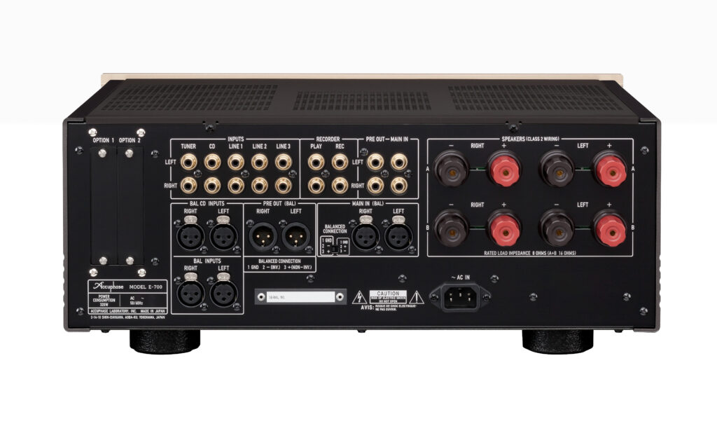 Optisch präsentiert sich der Accuphase E-700 in der typischen Designsprache der Marke: champagnerfarbenes Frontpanel, präzise gefräste Bedienelemente und die ikonischen VU-Meter stehen für zeitlose Eleganz und Wertbeständigkeit. Optional lässt sich der Verstärker mit Phono- oder Digital-Eingangsmodulen erweitern und flexibel an individuelle Anlagenkonzepte anpassen.